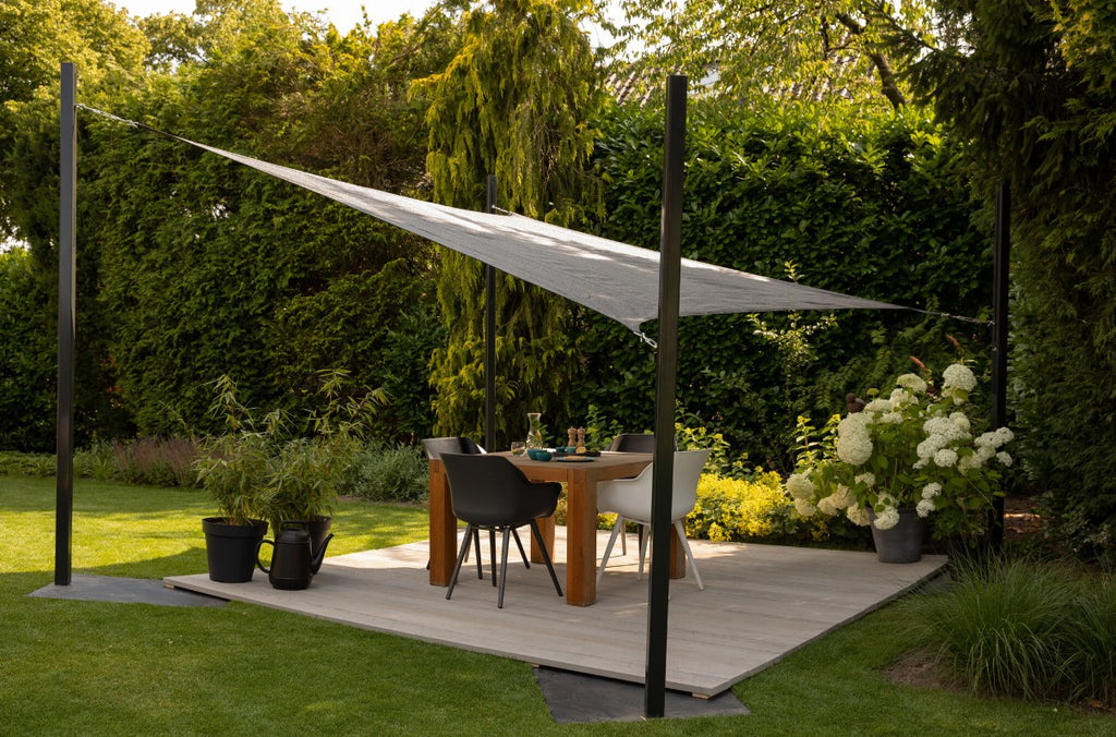 Je bevestigt het schaduwdoek aan gevel en/of palen. Een stevige boom of verankerde schuttingpaal kan ook dienen ter bevestiging.