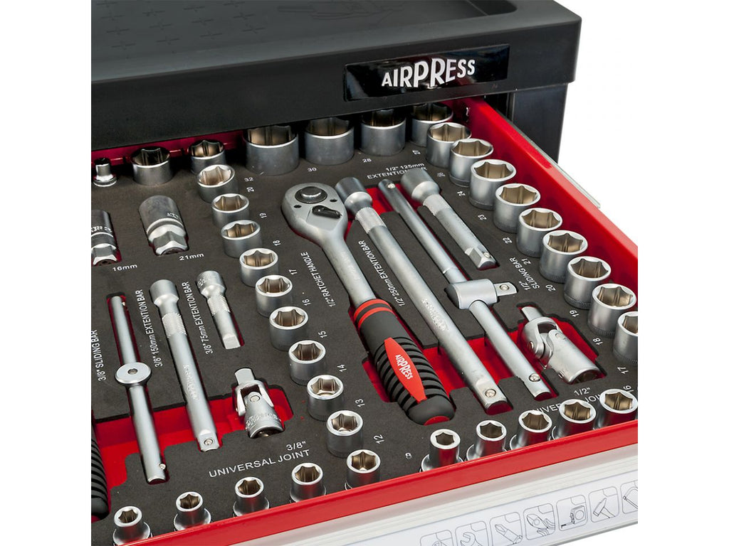 Gereedschap opbergen kun je doen in de 217-delige gereedschapswagen met 7 laden. De set bestaat uit de gereedschapswagen inclusief gereedschap. Deze gereedschapswagen wordt uitgerust met stevige handgrepen met soft grip en antislip composiet. De hoeken zijn voorzien van rubberen covers.