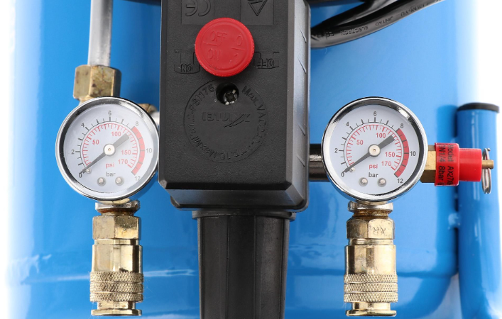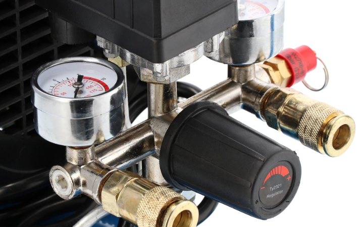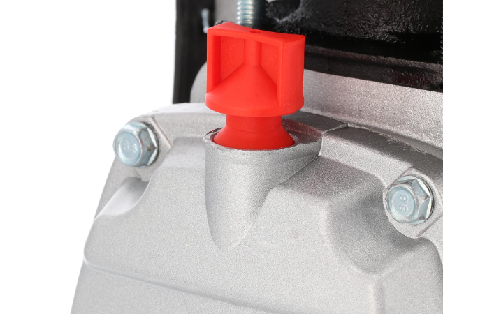 Met het reduceerventiel, te herkennen aan de rode knop, stel je snel en eenvoudig de gewenste werkdruk in. Op de manometer onder de rode knop kun je de ingestelde druk aflezen. De compressor is compact en kan eenvoudig vervoerd worden. Dit komt door de twee wielen en de beugel.