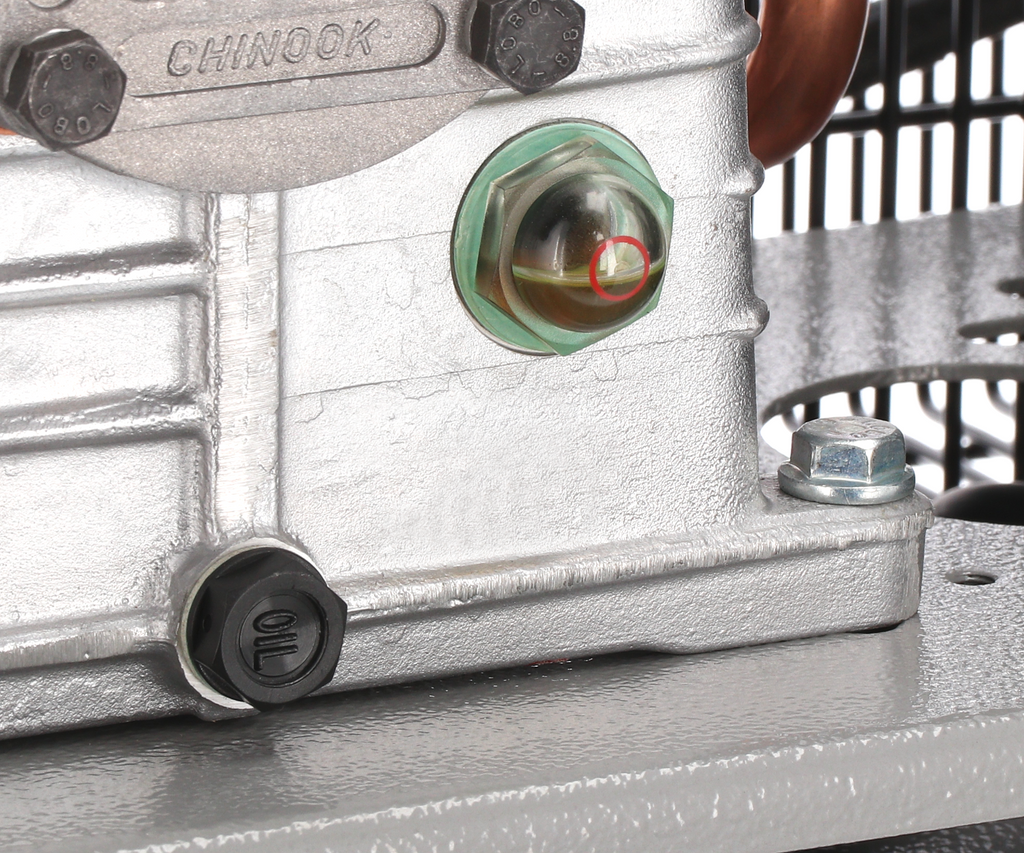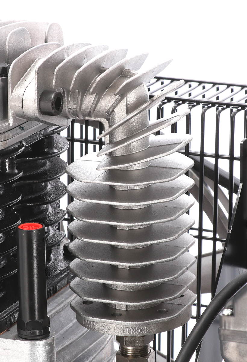 Op deze compressor is een compressie motor bevestigd van 3 pk, 1 traps en 2 cilinders. Door de twee cilinders zal de tank efficiënter en sneller gevuld worden. De compressor is voorzien van een grote carter met kijkglas, zodat je de olie stand eenvoudig goed in de gaten kunt houden. Tevens kun je de olie pijlen met de oliepeil stok.