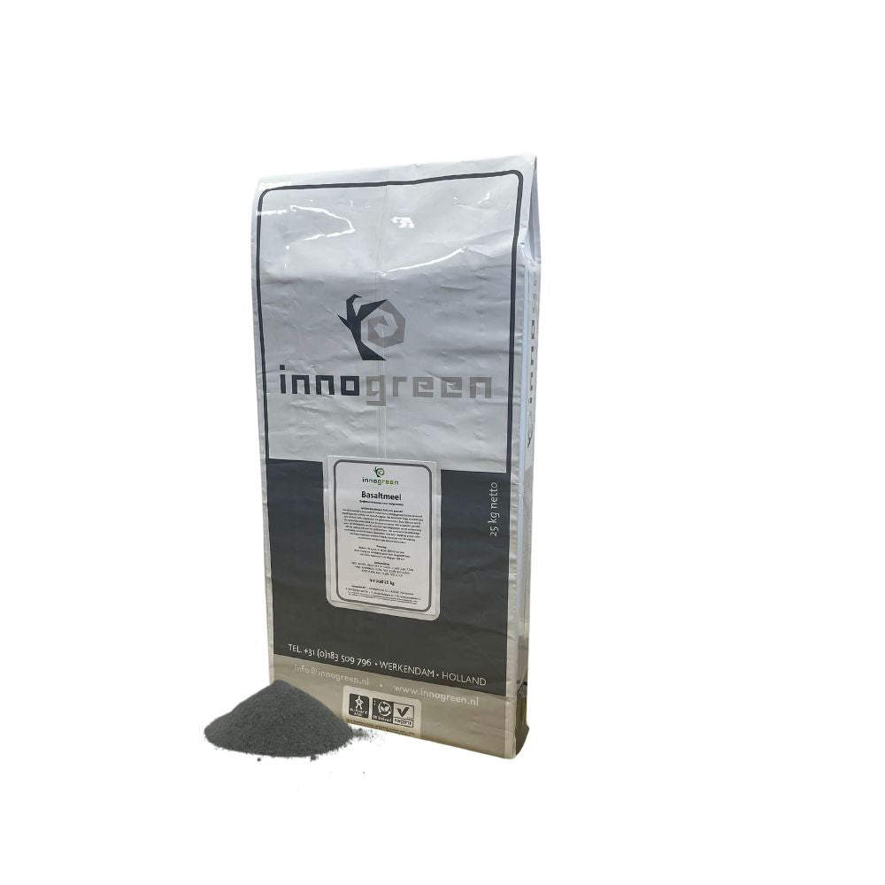 Basalt is een mafisch vulkanisch stollingsgesteente dat gevormd wordt door de stolling van lava of magma. De stolling van het basalt vindt plaats aan het aardoppervlak en daarom is basalt een uitvloeiingsgesteente, rijk aan mineralen. Wordt in de bio-teelt als stuifpoeder toegepast ter bestrijding van plagen en ziekten op fysische wijze. Het poeder vormt een barrière voor ziekten. Het bevat een hoge concentratie aan silicum, kalk, magnesium en sporenelementen. Door Silicum wordt de natuurlijke weerstand van de plant versterkt. Basaltmeel is bijzonder geschikt voor kleigronden. Het verbreekt de onderlinge verbinding tussen de zware kleideeltjes. Hierdoor wordt de grond ruller en beter bewerkbaar. Basaltmeel heeft de positieve eigenschap om stikstof vast te leggen, zodat deze niet zo vlug uitgespoeld wordt. Basaltmeel is ook geschikt om toe te voegen aan uw composthoop.