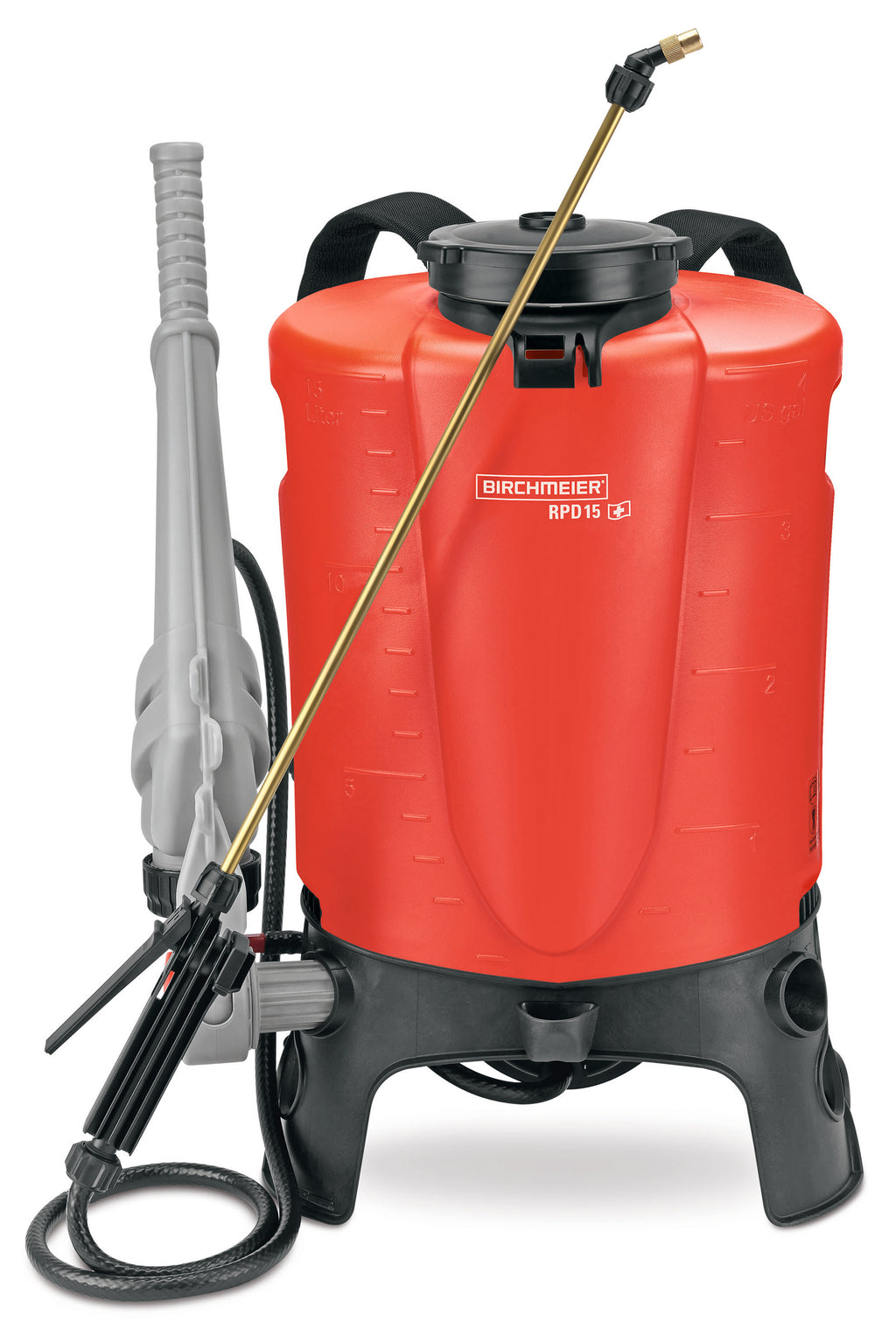 Ergonomisch gevormde tank met draagriemen met kliksysteem. Regelbare messing sproeidop. Pomphendel zowel links als rechts te monteren.
