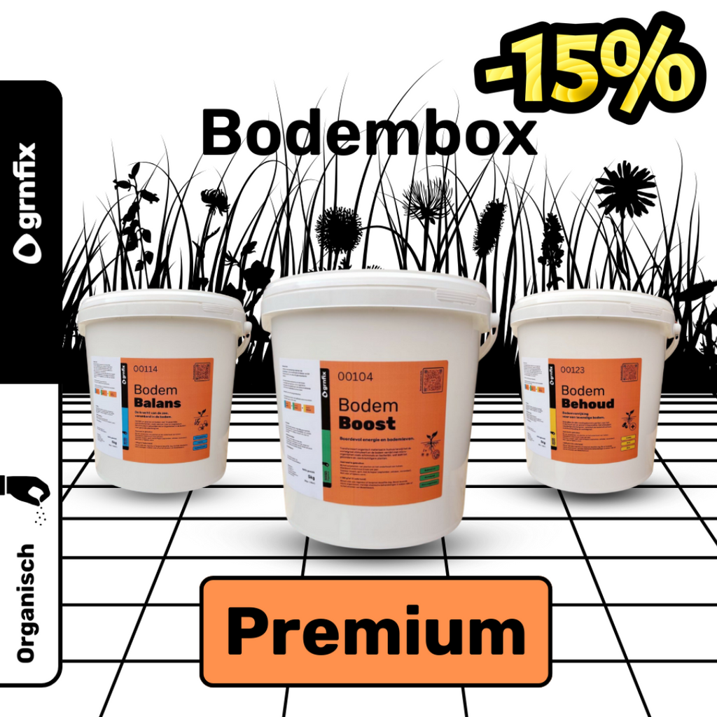 Met de BodemBox Premium geef je je tuin de ultieme natuurlijke boost, perfect voor maximale groei en intensief herstel. Deze krachtige mix van 100 g/m² BodemBoost, 50 g/m² BodemBalans en 600 g/m² BodemBehoud combineert een hoge dosis micro-organismen uit endosporen met een rijke mineralenmix (32% Calcium, 5% magnesium, 70+ spoorelementen). De BodemBox Premium is ideaal voor veeleisende tuinen en zware bodems.