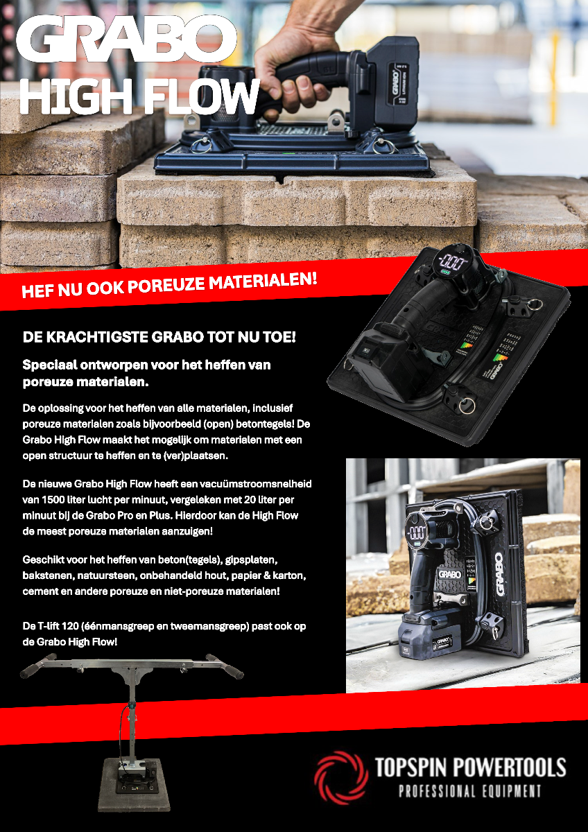 Met de Grabo High Flow kunt u snel en veilig materialen zoals glas, tegels, beton, en meer tillen en verplaatsen, wat uw productiviteit en efficiëntie op de werkplaats aanzienlijk verhoogt.