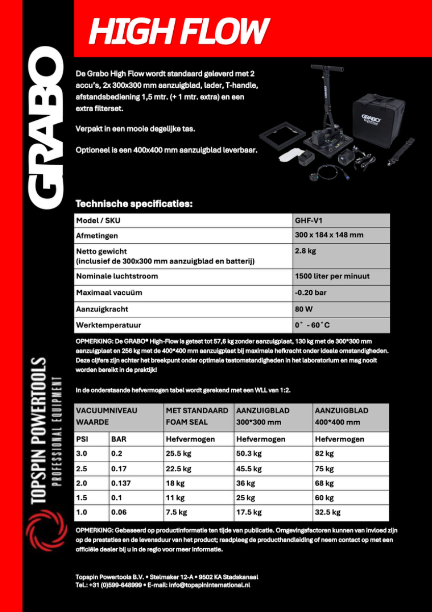 - Compact en Lichtgewicht: Met afmetingen van 300 x 184 x 148 mm en een netto gewicht van slechts 2.8 kg, inclusief de 300x300 mm aanzuigblad en batterij, is de Grabo High Flow gemakkelijk mee te nemen en te gebruiken op elke locatie.
