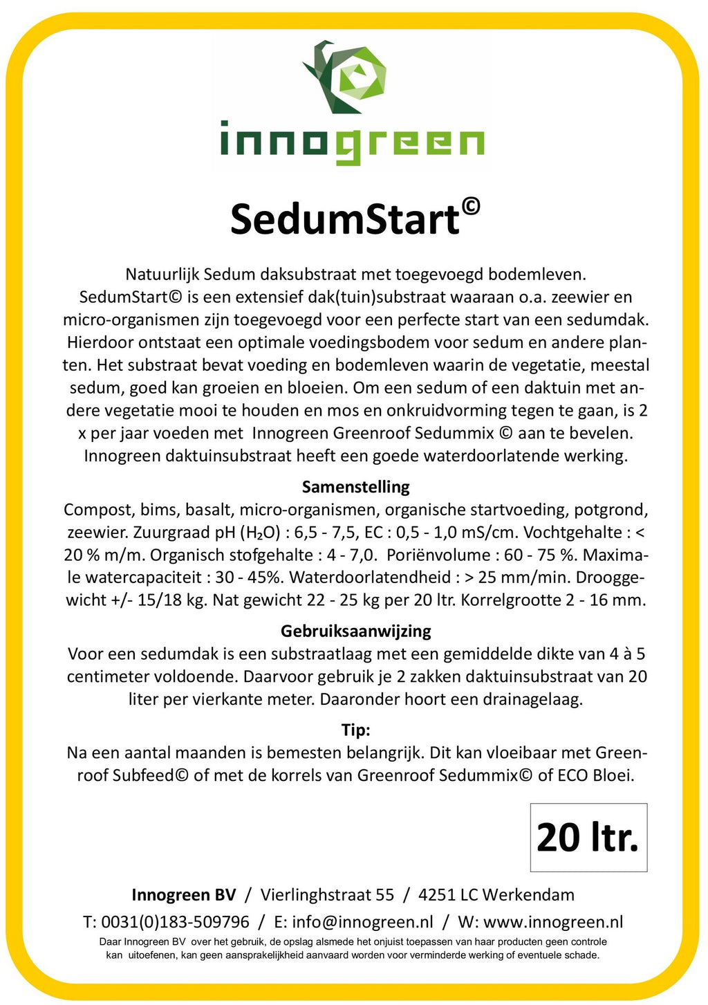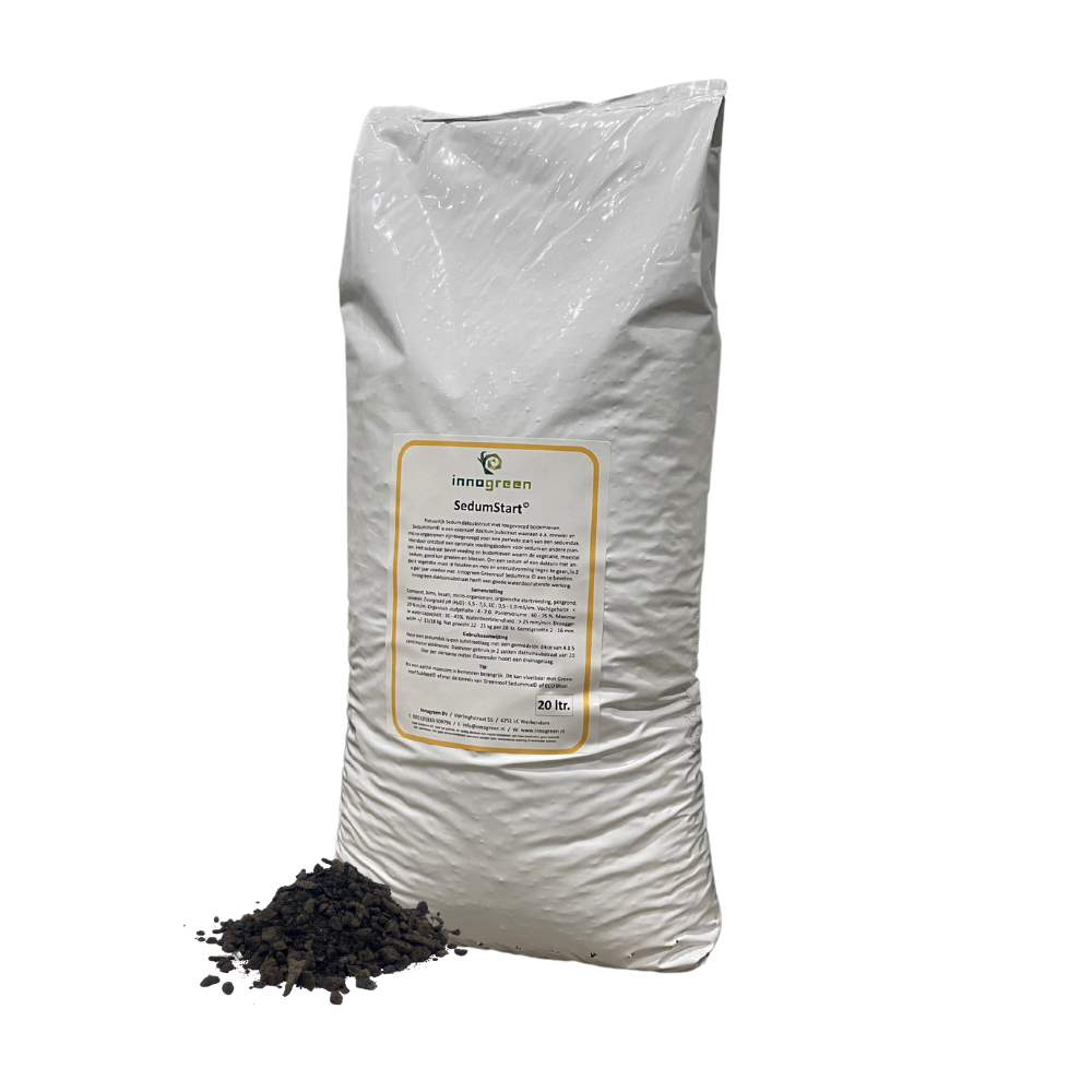 Innogreen SedumStart is een speciaal ontwikkeld extensief daktuinsubstraat dat ideaal is voor de aanleg van sedumdaken. Dit substraat bevat onder andere zeewier, organische startvoeding en nuttige micro-organismen. Door deze unieke samenstelling ontstaat een optimale voedingsbodem waarin sedum en andere dakplanten zich snel kunnen vestigen, gezond blijven en mooi op kleur komen.