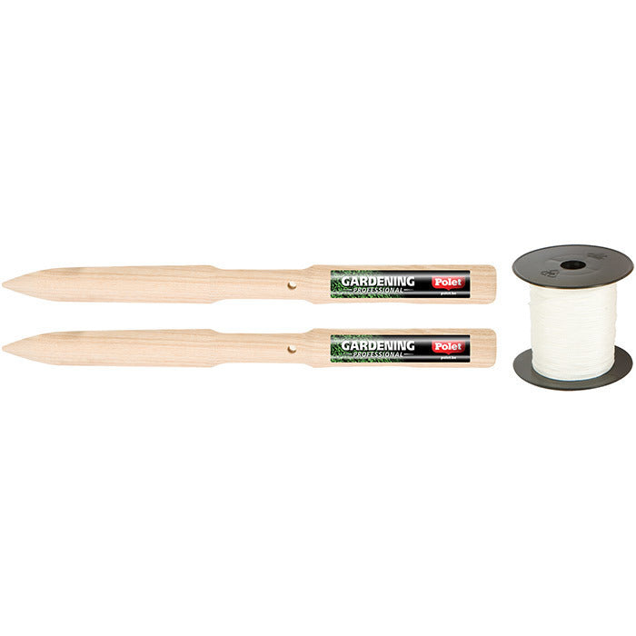 Voorzien van 2 gepunte essenhouten stokjes die makkelijk de grond in gaan, koord kan zo perfect opgespannen worden