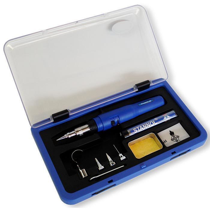 Deze set van het Duitse merk Stannol is perfect voor soldeerwerkzaamheden op locatie, maar ook is hij ideaal voor het krimpen van bijvoorbeeld krimpkous. De set wordt geleverd in een kunststof box met daarin een gassoldeerbout, dispenser soldeertin, enkele opzetstukken, soldeerspons en een sleutel voor het wisselen van de opzetstukken.