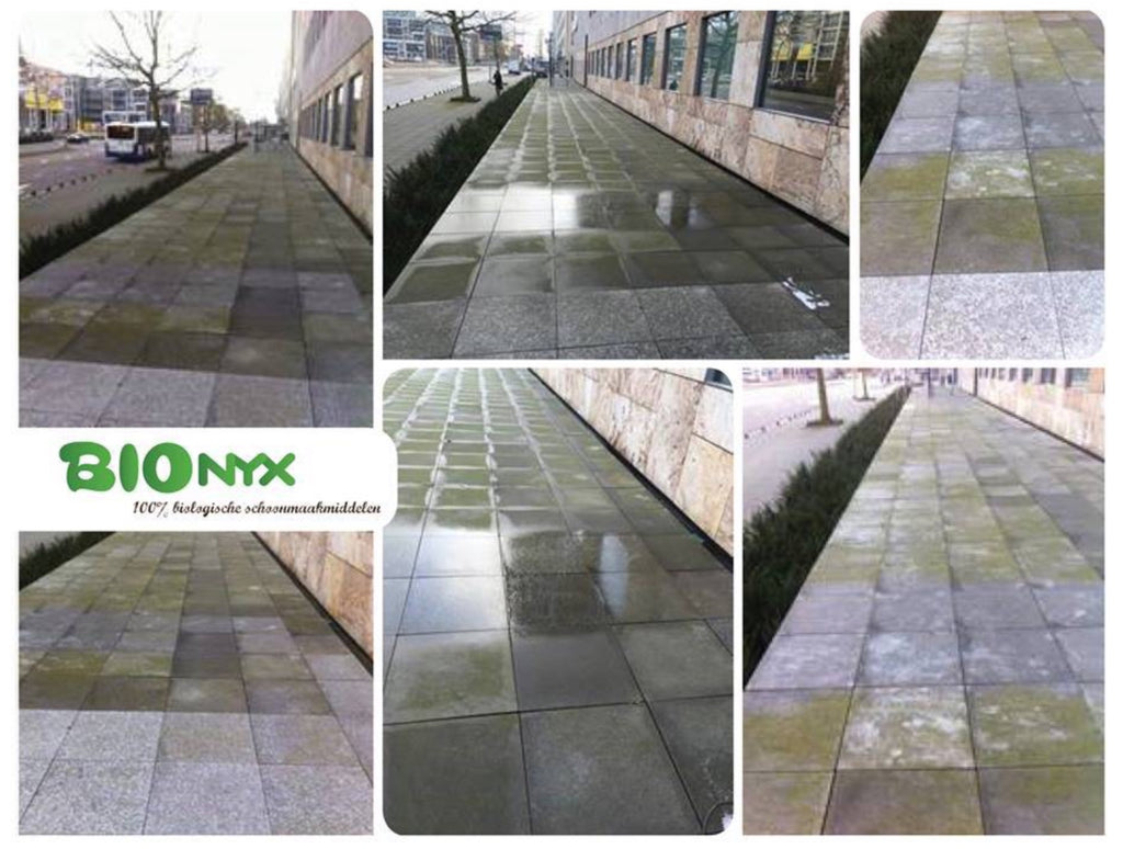 Waarom NIET reinigen met een hogedrukspuit? Op welke manier je uiteindelijk je terras, balkon en oprit schoonmaakt, belangrijk is dat je altijd bladeren, optisch vuil en zandresten regelmatig verwijdert. Dit is de ideale bron voor atmosferische aanslag. Een hogedrukspuit lijkt oh zo handig. Echter niets minder is waar. Door de kracht maak je de toplaag poreuzer en het vuil kan zo in de tegel trekken. Daarnaast, wordt het oppervlak ruwer en daardoor keren bijvoorbeeld mossen en vuil sneller terug. En dan heb ik het nog niet eens gehad over het opspattend water en vuil. Ook schoonmaakazijn is niet de oplossing, wel tijdelijk maar het zorgt er wel voor dat flora en fauna afsterven. Dus zeer schadelijk voor het milieu. BIOnyx Terras & Opritreiniger, 100% biologisch en afbreekbaar, hoef je alleen aan te brengen, schoon zonder schrobben. Puur, eerlijk en duurzaam. Wel zou je op een droge en zonnige dag alle plantenbakken, potten en stoelen van je terras of balkon kunnen verschuiven, zodat de ondergrond kan drogen waardoor de verhoogde kans op atmosferische aanslag stukken kleiner wordt. En dan eindelijk is het genieten en waar doe je dat beter dan op zo’n schoon terras of balkon? En laat de lente nu maar komen!